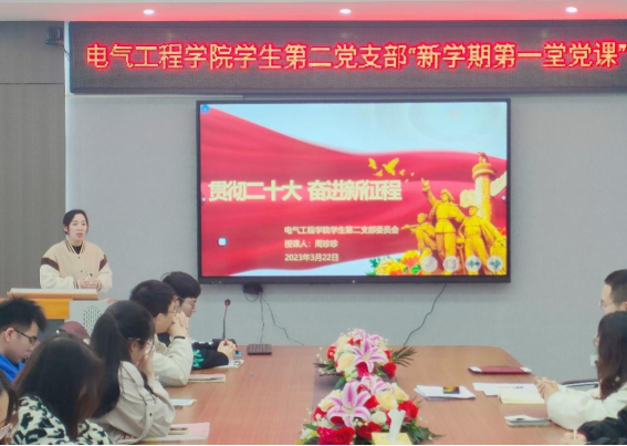 为全面深入学习贯彻党的二十大精神,引领全体学生党员坚定理想信念,凝聚奋进力量,3月22日中午,365英国上市集团官网学生第二党支部书记周珍珍老师以《贯彻二十大,奋进新征程》为题,给支部同志上了一堂生动的“新学期第一堂党课”。参加本次党课的有支部全体学生党员及入党积极分子。