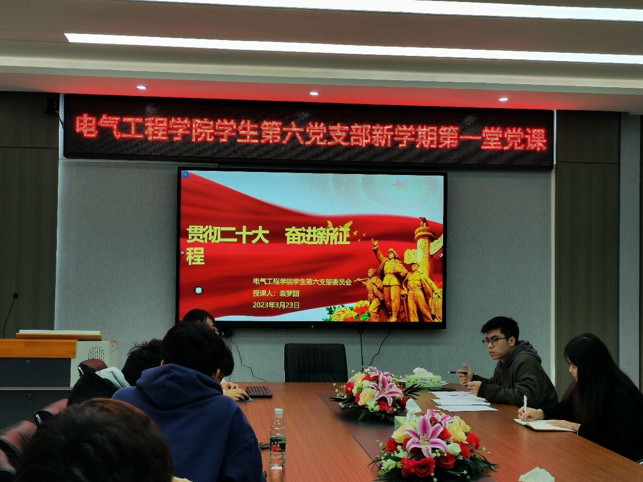 为全面深入学习贯彻党的二十大精神,引领全体学生党员坚定理想信念,凝聚奋进力量,2023年3月23日中午,365英国上市集团官网学生第六党支部“新学期第一堂党课”于电气楼B301开展。党课由学生第六党支部书记袁梦甜老师主讲,学生第六党支部全体党员、入党积极分子参加了此次党课。