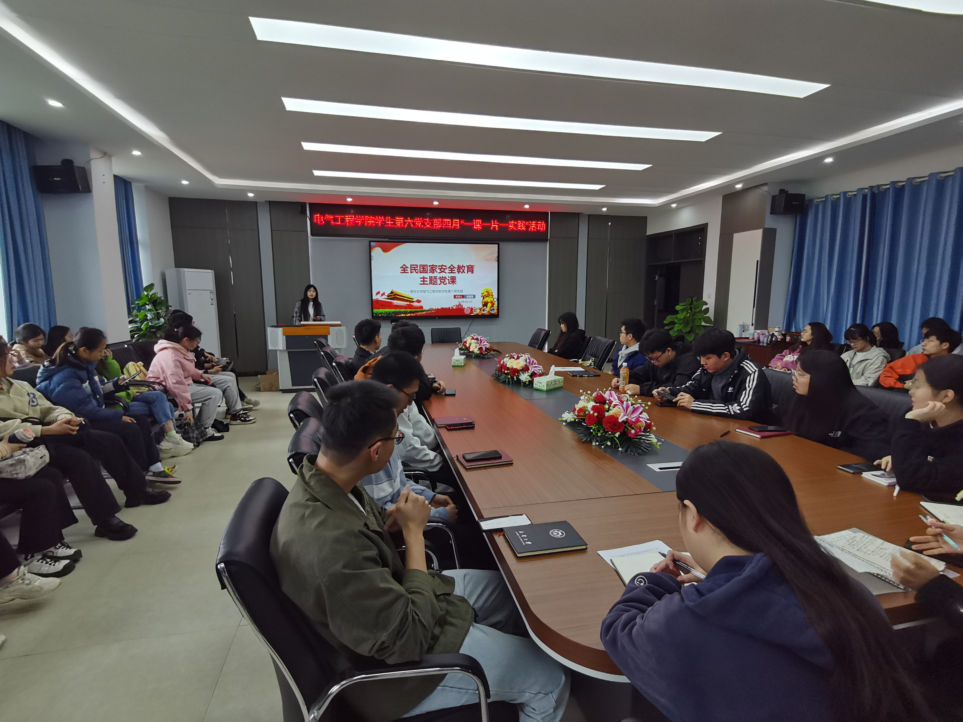 会上,学生第六党支部组织委员杨苗苗以“全民国家安全教育”为主题给全体与会人员上党课。随后,支部组织全体学生观看保密教育片《汇聚人民力量 维护国家安全》。该教育片通过对国防、军事等多个涉及不同国家安全领域的案例进行讲述,为全体学生上了一堂生动鲜活的国家安全教育课。最后,支部组织全体学生在校园开展国家安全知识宣传实践活动。