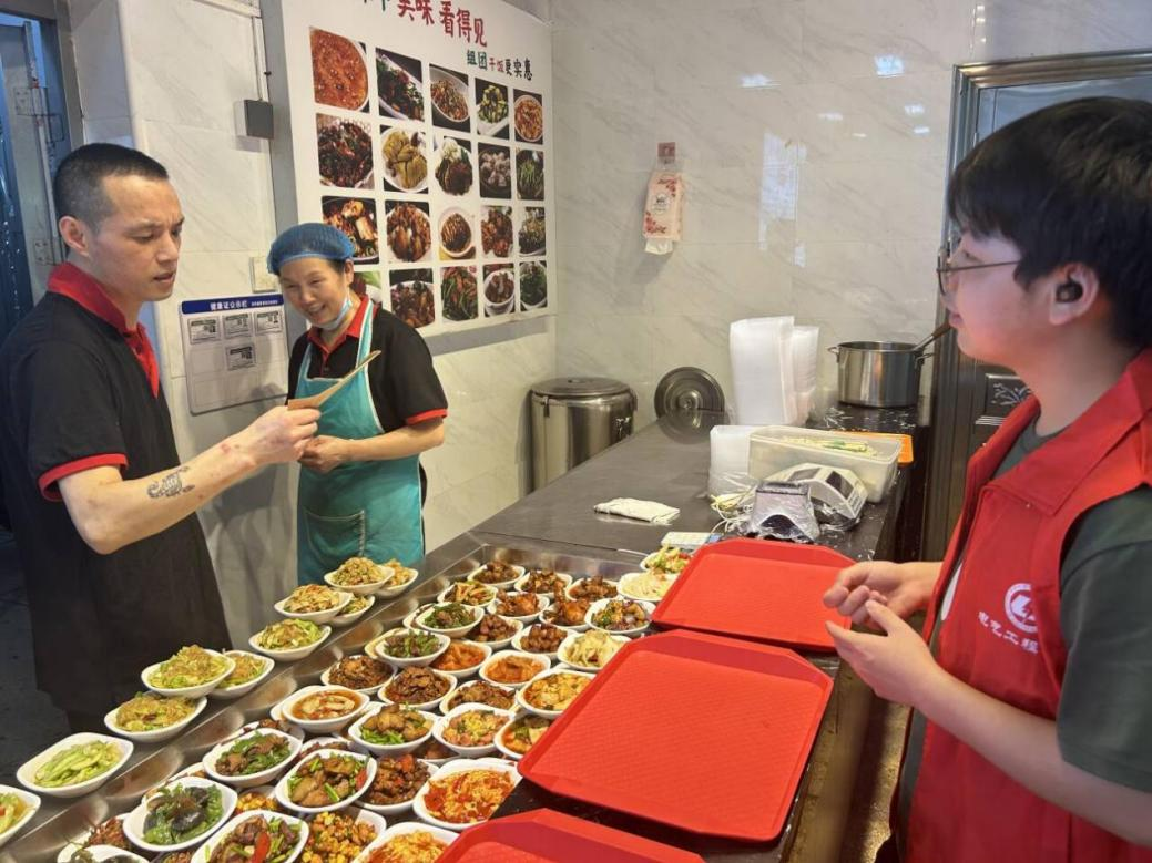 志愿者们将手中的信封送给食堂的劳动者们,为劳动者们献上属于他们节日的祝福。