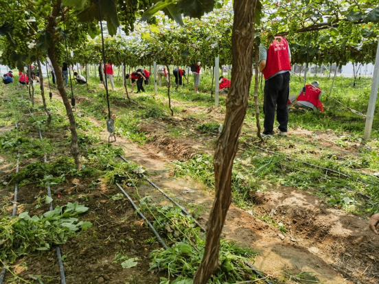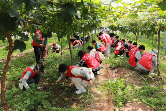 参观完毕,师生们来到了新桥村重点打造的清花湾聚晴葡萄基地,由当地农业专家讲解农业精细化管理以及所取得的显著效果,并演示了修剪、疏果、滴灌等工作过程,通过一系列有别于传统农业的管理措施,达到了“节能、环保、精确、丰产”的奋斗目标,其间还对同学们感兴趣或不明白的地方进行解答,使大家对于现代农业生产流程有了更加明确的认知。纸上得来终觉浅,绝知此事要躬行,最后全体师生扑下身子、放下架子、甩开膀子为葡萄园除草。头上骄阳似火,葡萄架下闷热如蒸笼,不过几分钟大家就满头大汗,衣衫湿透。很多自小在城里长大的同学,在这里经历了第一次拔草,第一次泥巴沾满双手,第一次汗水流进口中又苦又涩;但大家热情依然高涨,没有一位同学退缩,大家相互协助教授方法,在经历了刚开始的茫然无措后,一切都变得井然有序起来,劳动效率也大幅提高,并且有了很多新的发现:超市里十几块一斤的野菜,这里被当做杂草直接扔掉的;薄荷叶子含在嘴里果然蛮清凉的;听旁边的同学说这种草的汁液能够治疗刀伤等等,每一次新的发现都会带来一点点小惊喜,劳动的过程也成为探索发现的旅程,欢声笑语始终萦绕在葡萄架下,并随着清风飘向远方。不到两个小时的劳动让所有参与者感到收获满满,同学们纷纷表示:以前听闻“一粥一饭,当思来之不易;半丝半缕,恒念物力维艰”只觉词句幽美,但只有亲自参与劳动、近距离接触劳动者,才能更加真切地体会劳动的艰辛与意义。