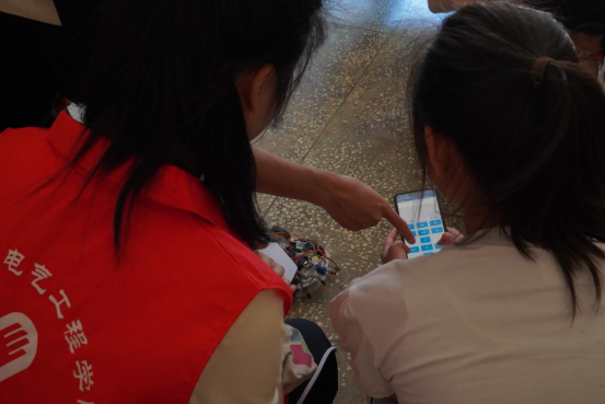 志愿者向孩子们演示如何通过手机操作,将智能小车控制往各个方向移动。随后孩子们也上手尝试操控智能小车。