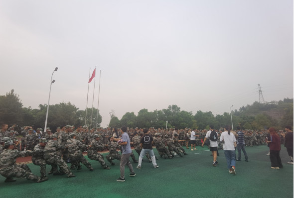 随着裁判的一声哨响,拔河比赛在雨母田径场正式拉开帷幕。各连队的新生们精神抖擞,摩拳擦掌,准备在比赛中一展身手。他们紧握长绳,双脚牢牢踩在地上,眼神中透露出坚定与自信。比赛过程中,同学们齐心协力,口号声、加油声此起彼伏,响彻云霄。每一次的用力拉扯,都凝聚着团队的力量;每一次的坚持不放弃,都彰显着军训期间锻炼出的坚韧品质。观众席上,师生们热情高涨,为参赛队伍加油助威。他们的欢呼声、掌声交织在一起,形成了一股强大的精神力量,激励着场上的每一位队员。军训教官们也纷纷加入到观众行列中,为新生们加油鼓劲,共同见证这一场力量与智慧的较量。经过多轮激烈角逐,最终十营一连凭借出色的团队协作和顽强的拼搏精神,夺得了拔河比赛的冠军。一位参赛队员说:“感谢这场比赛,让我们收获了团结和友谊。”