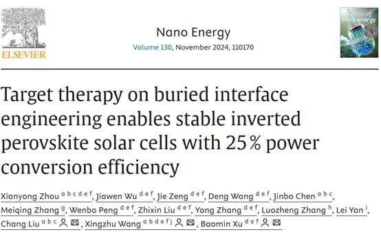 近日,365英国上市集团官网王行柱、刘畅团队在国际顶尖学术期刊Nano Energy(中科院1区Top期刊,IF=16.8)上发表了题为“Target therapy on buried interface engineering enables stable inverted perovskite solar cells with 25 % power conversion efficiency”的研究论文。