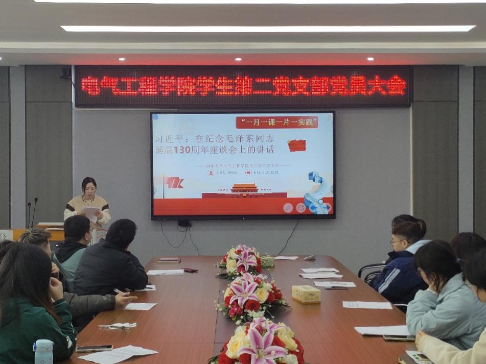 2023年12月29日上午10:00,党支部书记周珍珍老师领学了习近平总书记2023年12月26日《在毛泽东同志诞辰130周年座谈会上的讲话》。习近平总书记指出要把毛泽东同志开创的事业继续推向前进,以中国式现代化全面推进强国建设、民族复兴的伟业。周珍珍老师希望全体党员同志要认真学习本次讲话精神,不负时代、不负韶华,肩负起民族复兴和国家富强的重任。